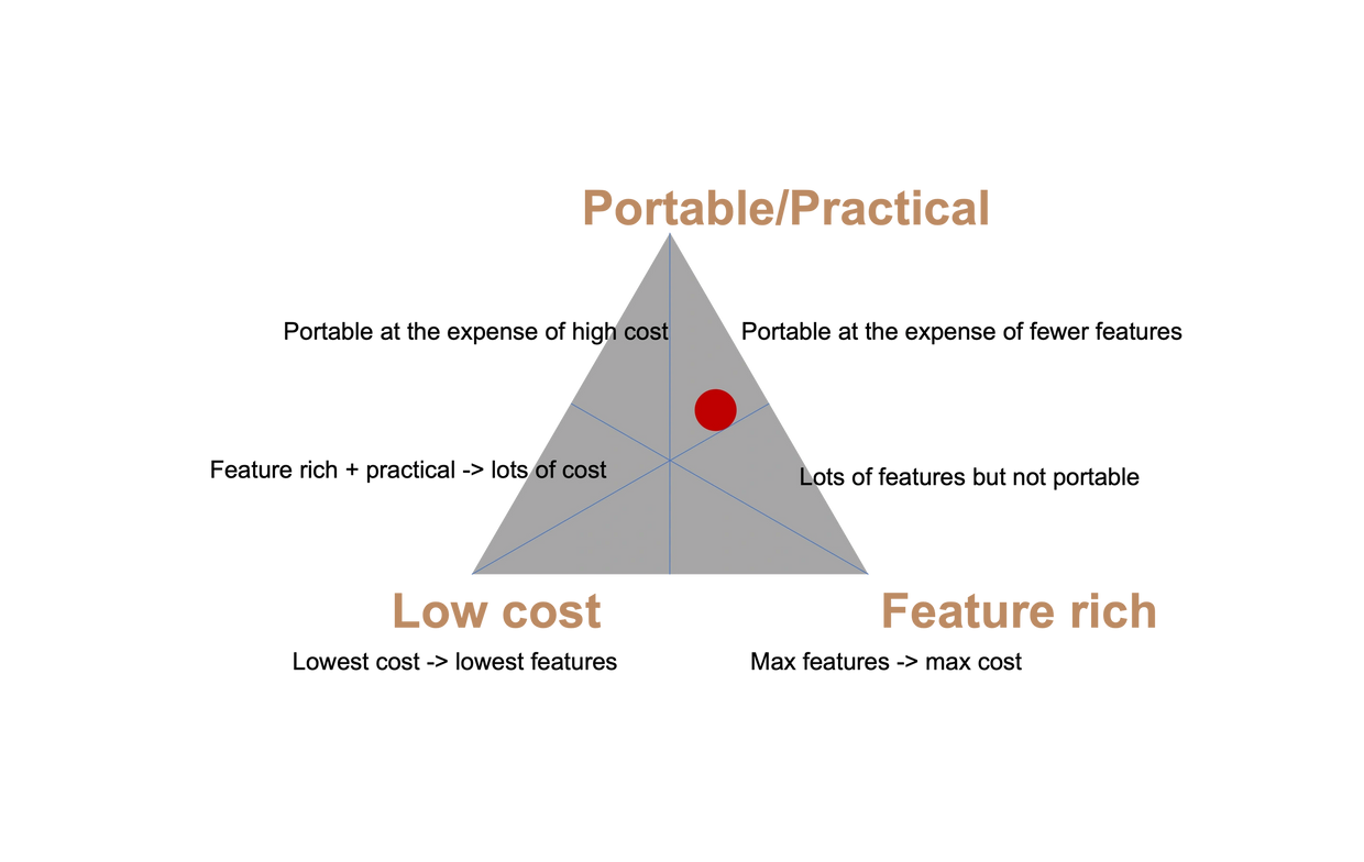 This is a version of the three-problem problem or maybe a radar chart (or triangle inequality?). Whatever it is called, it helped me conceptualize what kind of device to aim for. This is an arbitrary scale where the closer to the vertex, the better that constraint was satisfied. I'm denoting where I think my design is using the red circle.